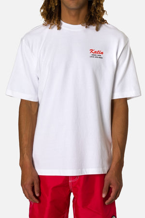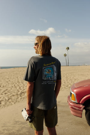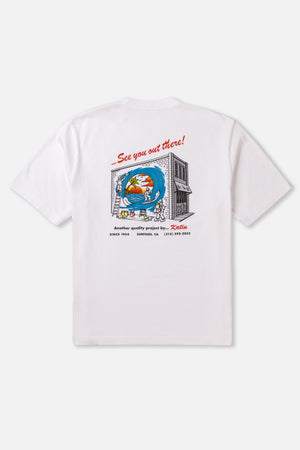 The Sherwin Box Fit Tee features artwork inspired by local business signage, printed on organic cotton with a relaxed, roomy silhouette.