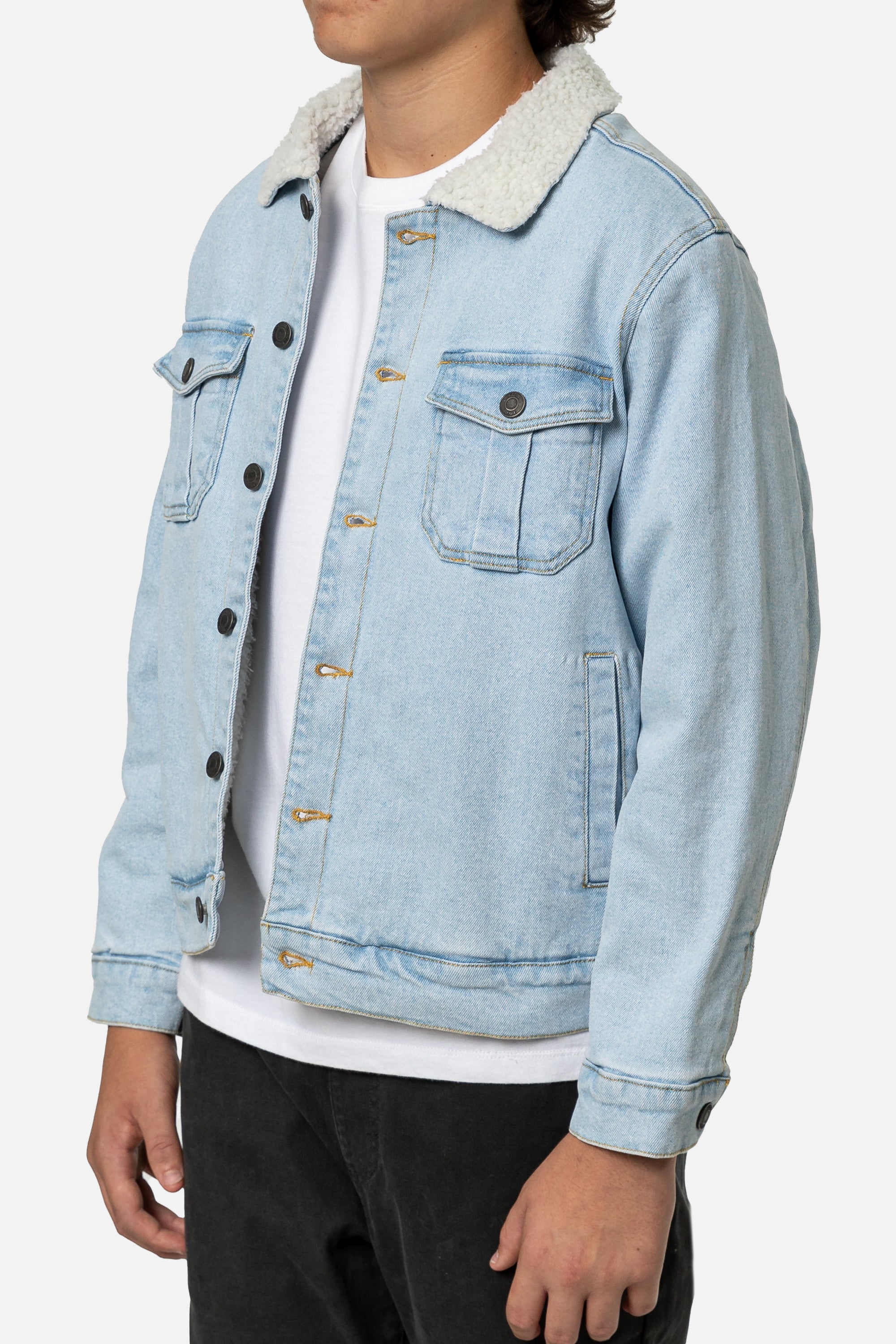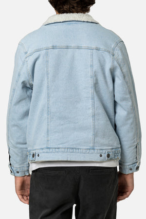 The Boys Harris Denim Jacket features a denim shell, custom sherpa body liner, taffeta sleeve lining, sherpa collar, front welt pockets, and chest patch pockets.
