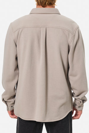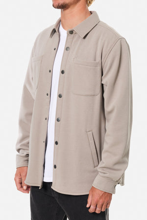 The Harold Fleece Shirt Jacket is made from soft poly-cotton fleece-backed twill fabric. It features front welt pockets, a snap front closure, and chest patch pockets.