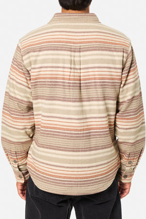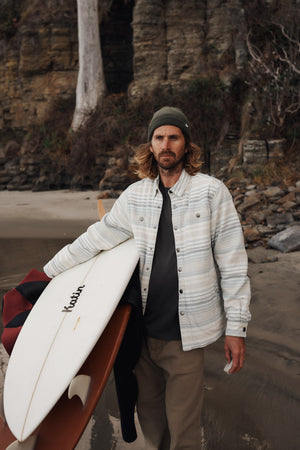 The Harold Stripe Jacket is a 100% cotton shirt jacket made from a brushed stripe flannel shell, featuring a custom sherpa body liner, taffeta sleeve liners, along with front welt pockets and chest patch pockets.