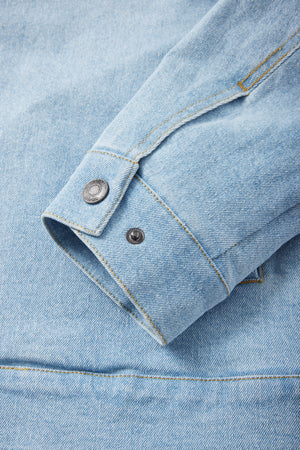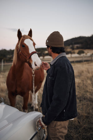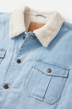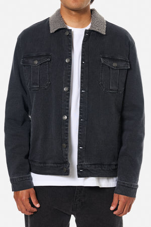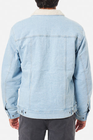 The Harris Denim Jacket features a denim shell, custom sherpa body liner, taffeta sleeve lining, sherpa collar, front welt pockets, and chest patch pockets.