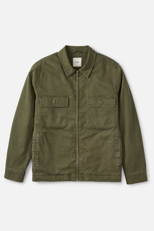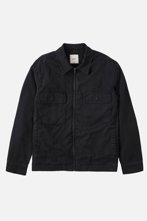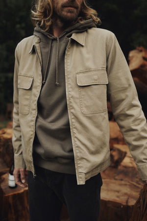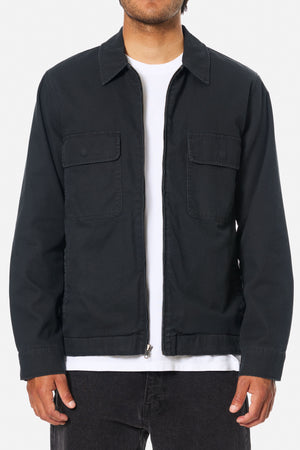 The Petrol Jacket is made from a 100% cotton slub shell, featuring a striped flannel lining and a zip-up design. It is complemented by front welt pockets and chest patch pockets.