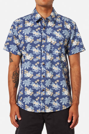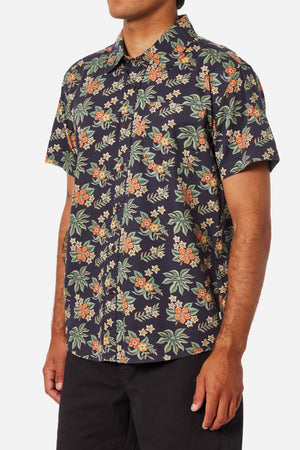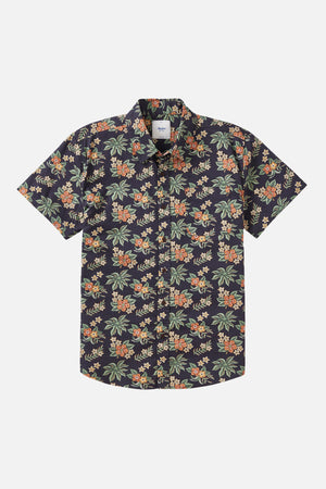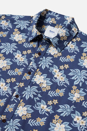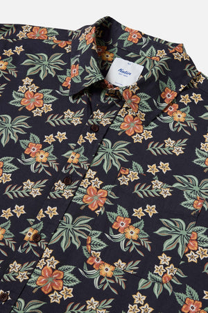 The Benji Shirt features a custom floral pattern inspired by tropical flowers, printed on a cotton-rayon fabric.