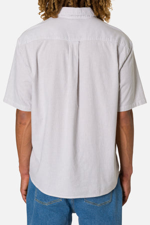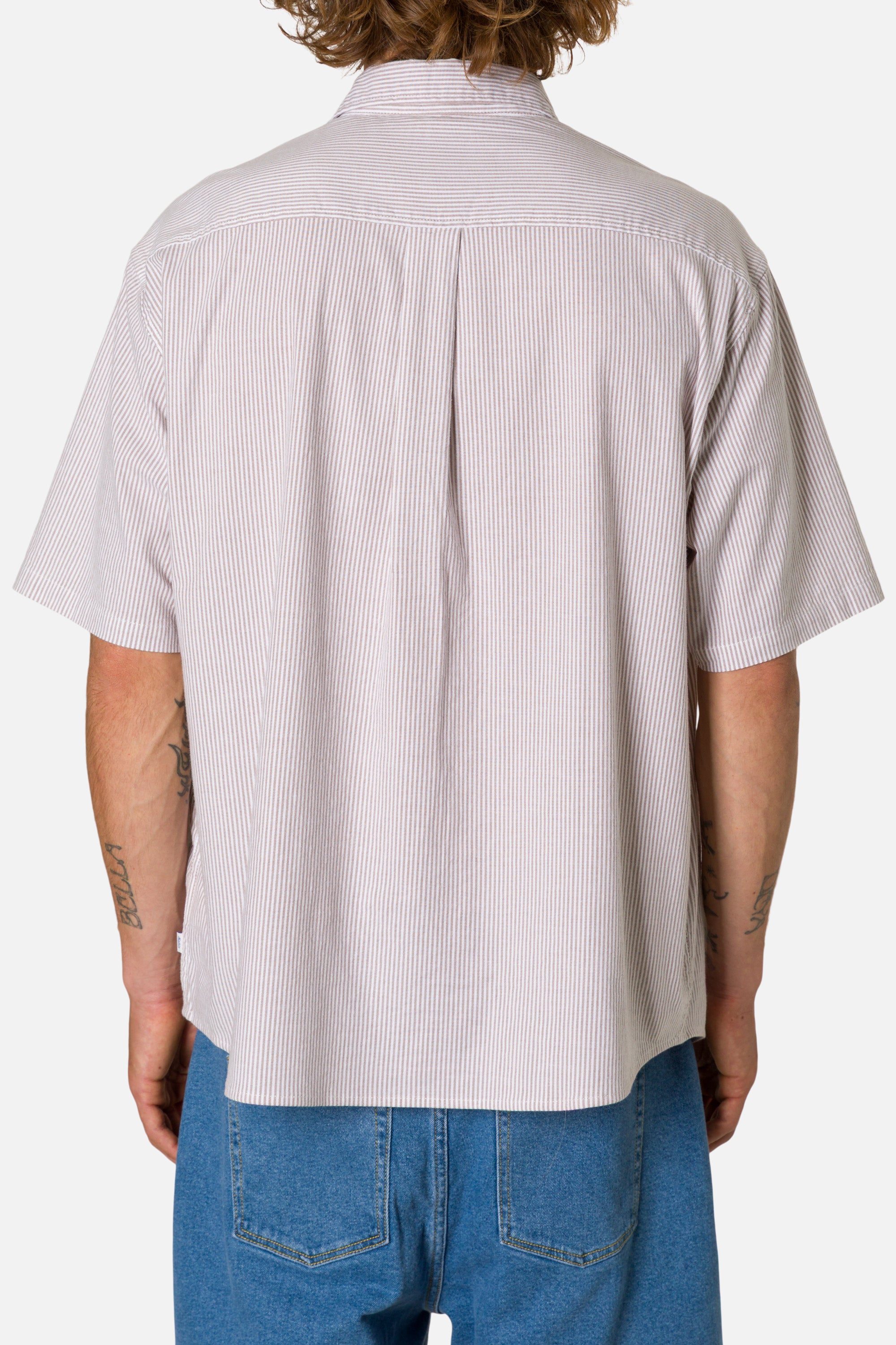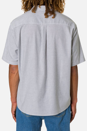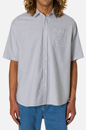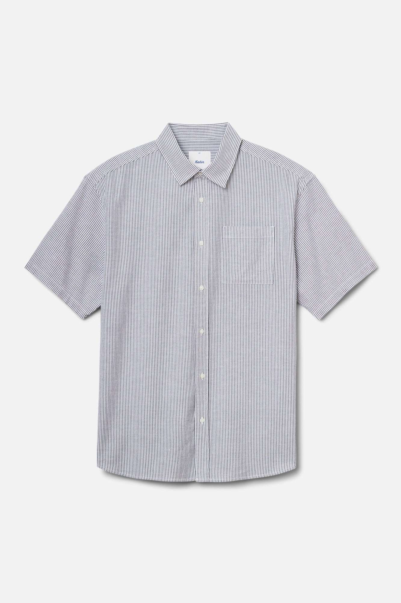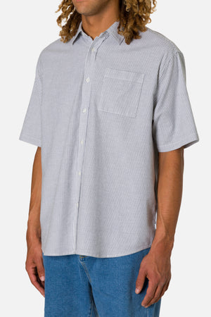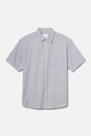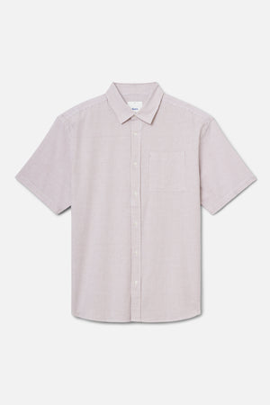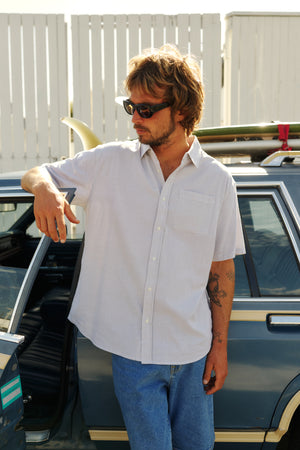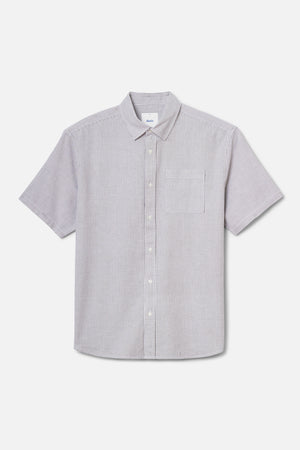 The Ezra Shirt blends cotton with a touch of stretch in an oxford stripe that moves comfortably through warm weather. The relaxed fit keeps the look modern.