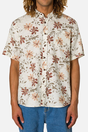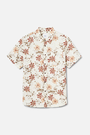 The Petals Shirt overlays a floral print on a cotton-linen herringbone, adding texture without weighing things down. A soft wash gives it that worn-in comfort from the start.