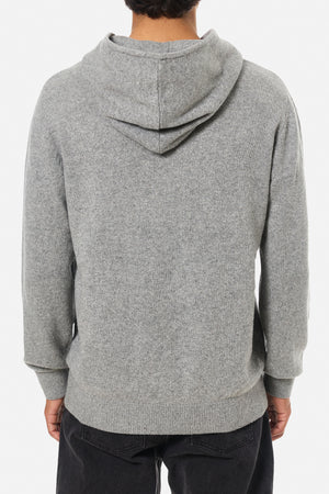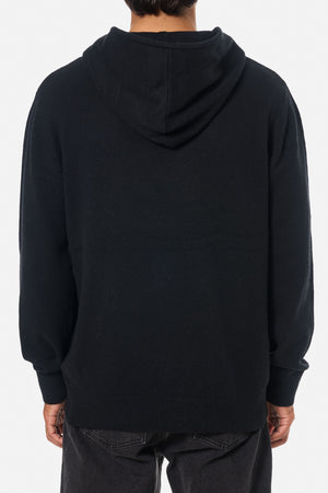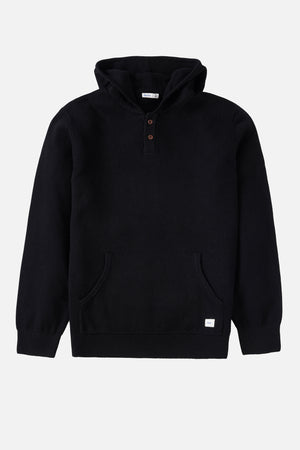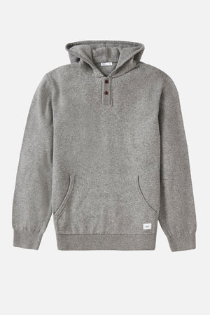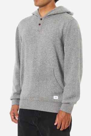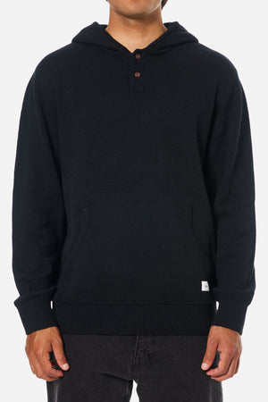 The Hayes Hooded Henley Sweater is crafted from a custom-blended yarn and features a two-button henley design, a kangaroo pocket, and a woven Katin label.