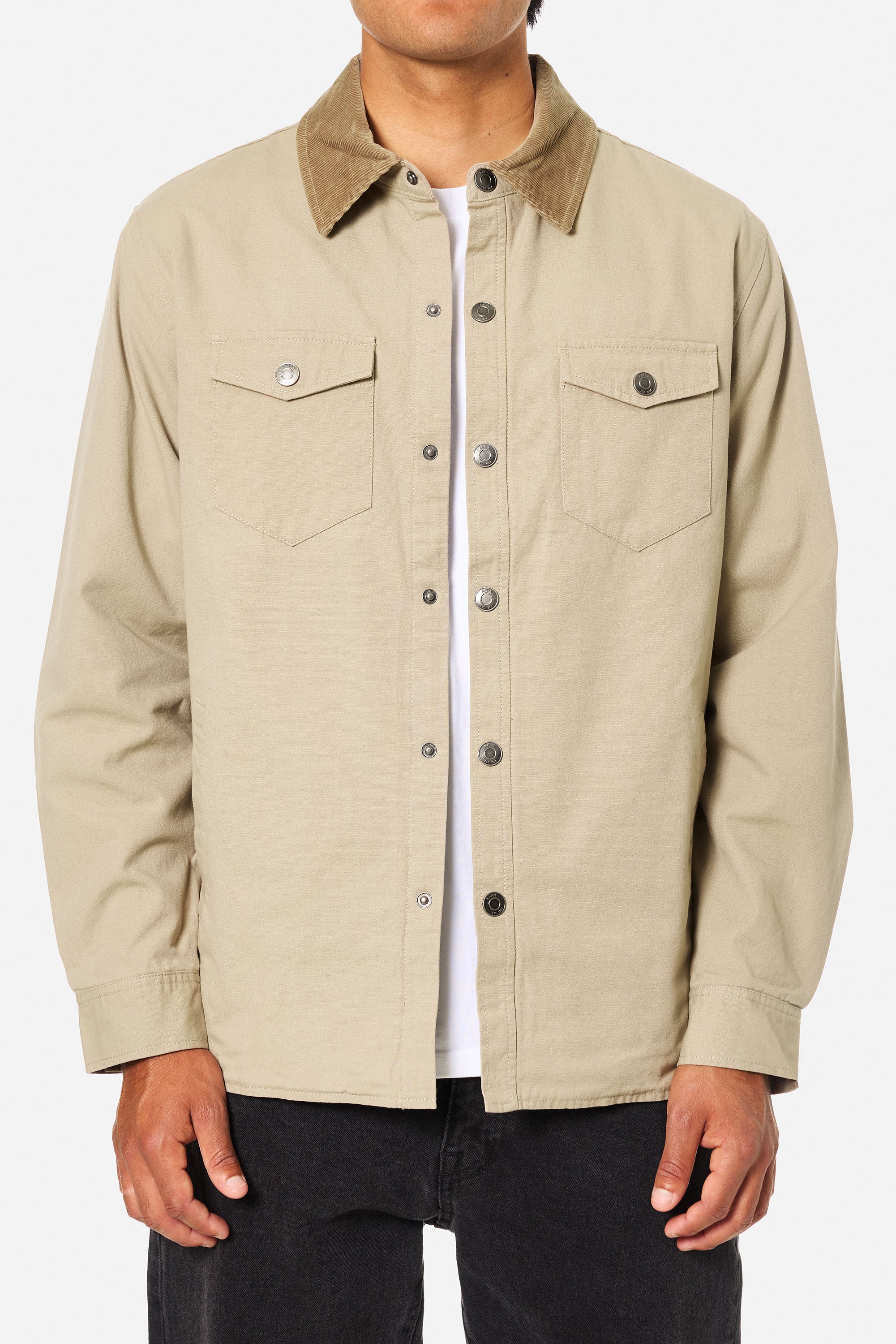 The Campbell Shirt Jacket is made from 100% cotton canvas and features a custom flannel body liner, snap front closure, poly sleeve liner, corduroy collar, front welt pockets, and patch chest pockets.