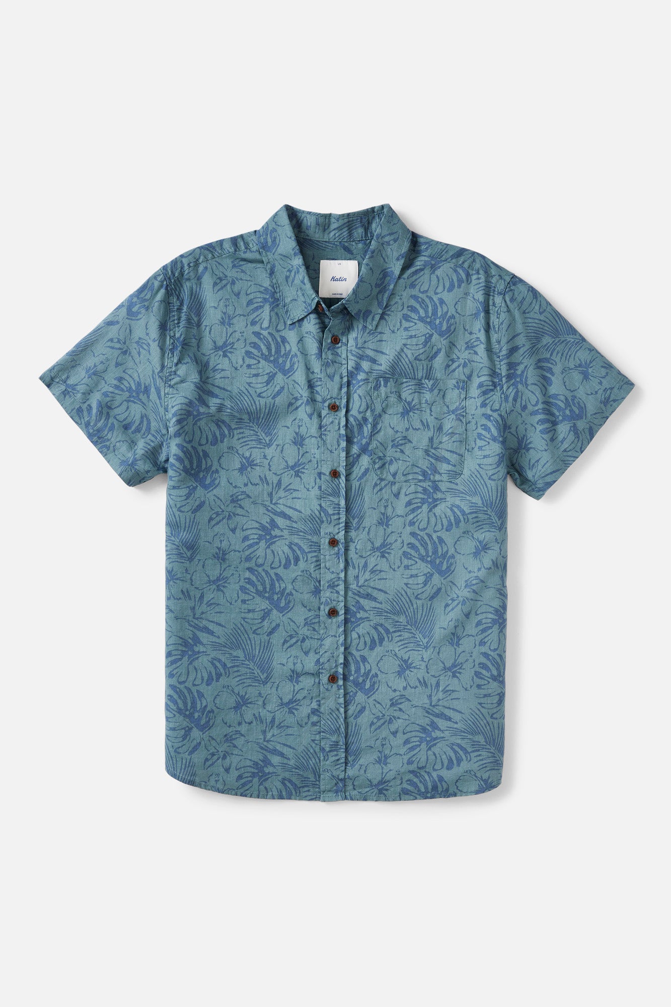 The Moco Shirt features a tonal floral graphic inspired by the islands, printed on a breathable cotton-linen blend.